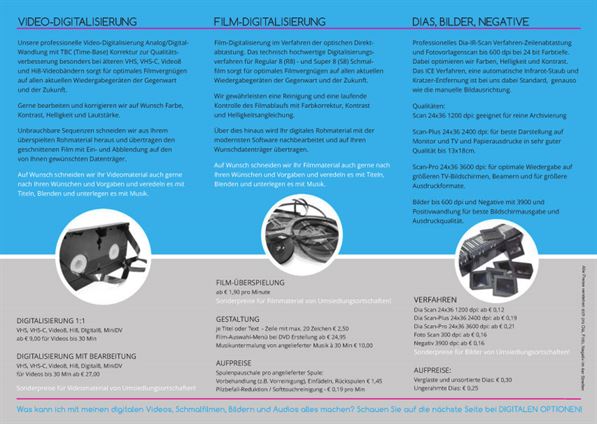Wir digitalisieren Ihre Schmalfilme, Videofilme, Schallplatten, Dias, Foto und Negative und Kompaktkassetten professionell in Fachkenntnis und dem modernsten Equipment und retten nicht nur ihr Material, sondern optimieren es sogar in Farbe, Helligkeit, Kontrast und Ton für die Ewigkeit.
